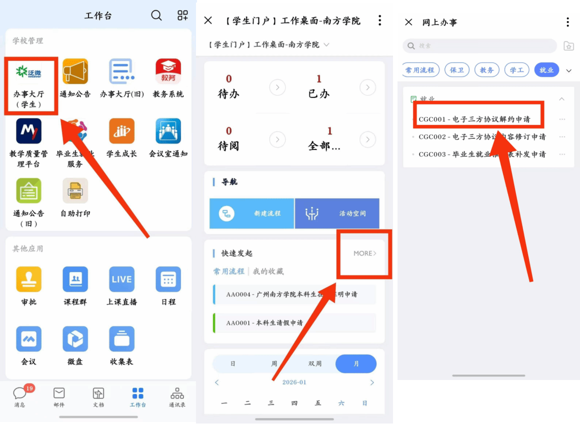 一、申请人进入本人的企业微信,点击“工作台”,进入“办事大厅(学生)”,点击“电子三方协议解约申请”流程;