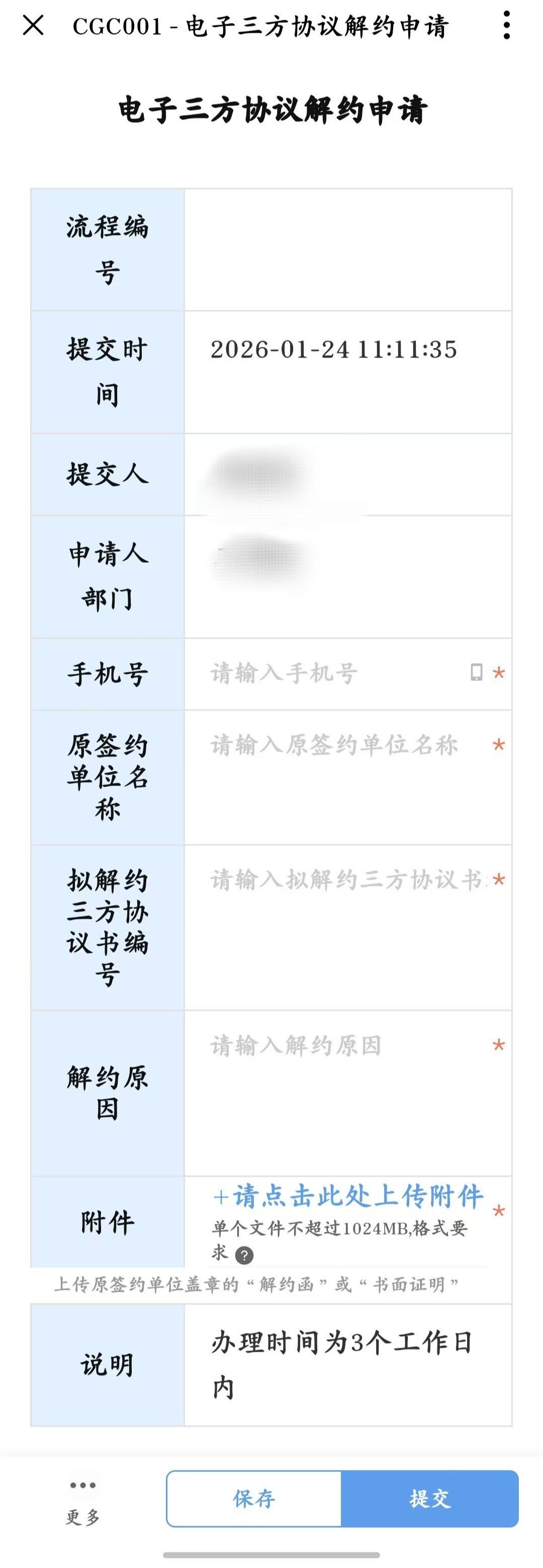 二、按系统提示分别填写:本人联系方式(手机号)、原签约单位名称、拟解约三方协议书编号、解约原因等内容,并上传“原签约单位盖章的解约函”等附件,进行“提交”。