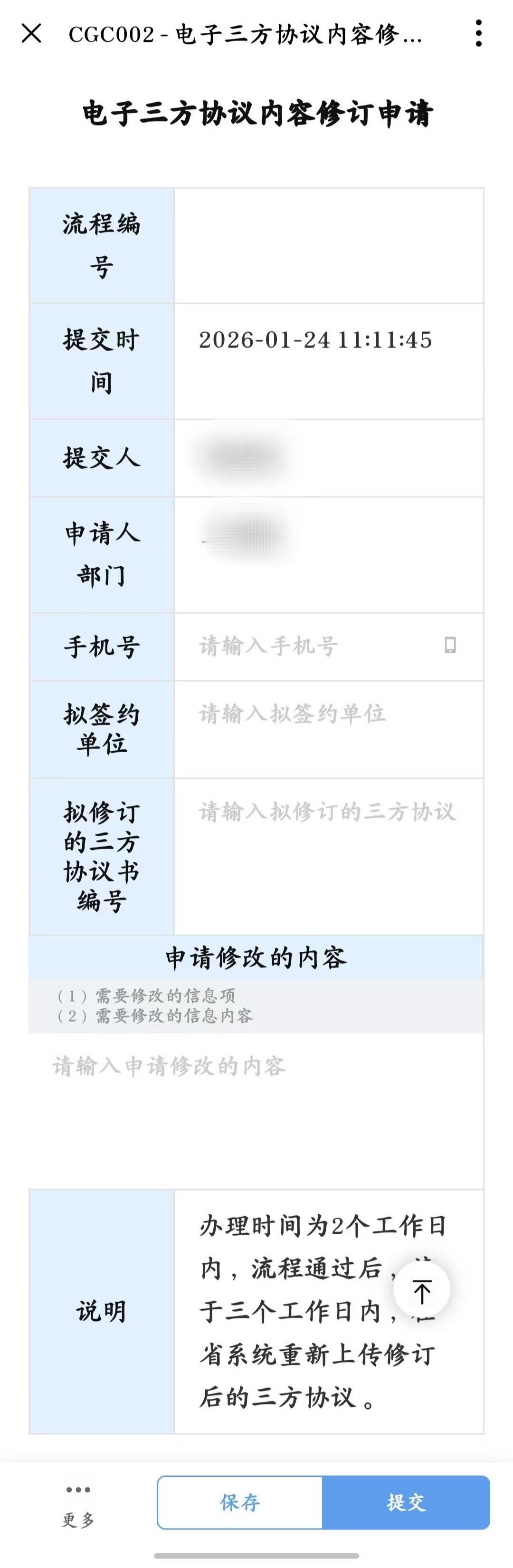 二、按系统提示分别填写:本人联系方式(手机号)、拟签约企业名称、拟修订的三方协议书的编号以及申请修改内容后,进行提交;