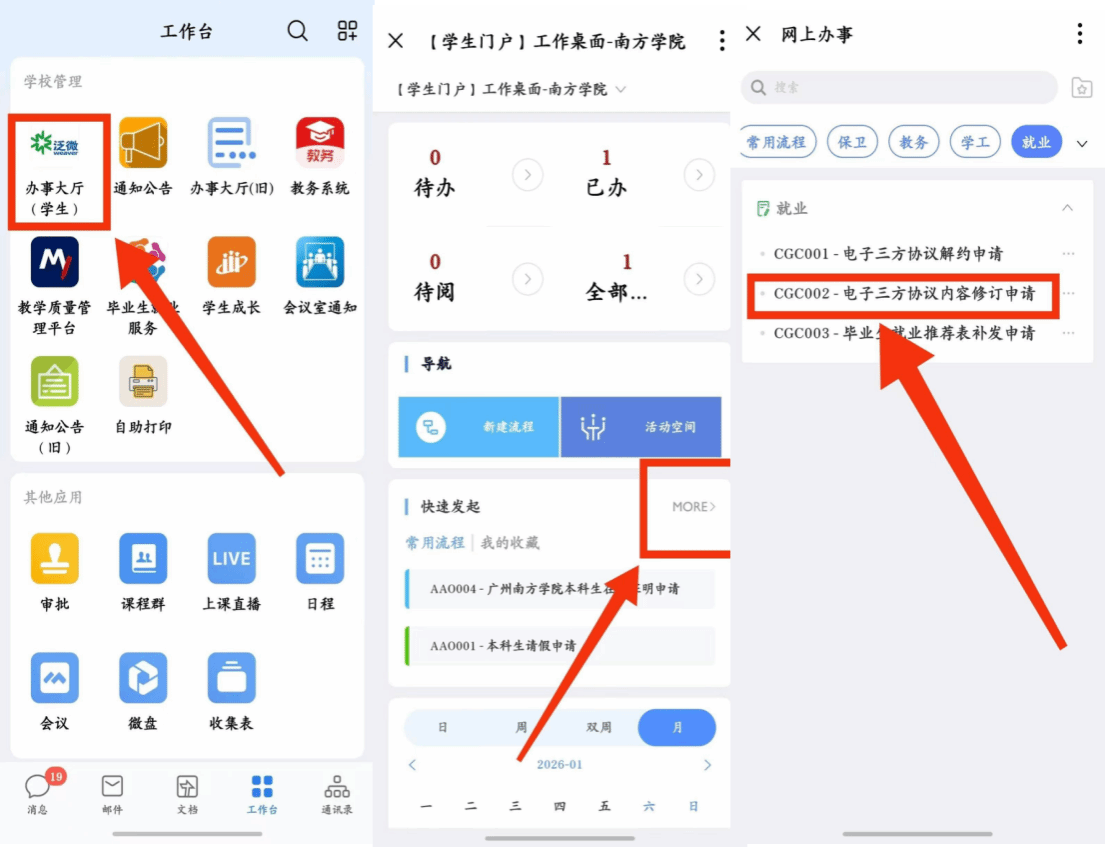 一、申请人进入本人的企业微信,点击“工作台”,进入“办事大厅(学生)”,点击“电子三方协议内容修订申请”流程;